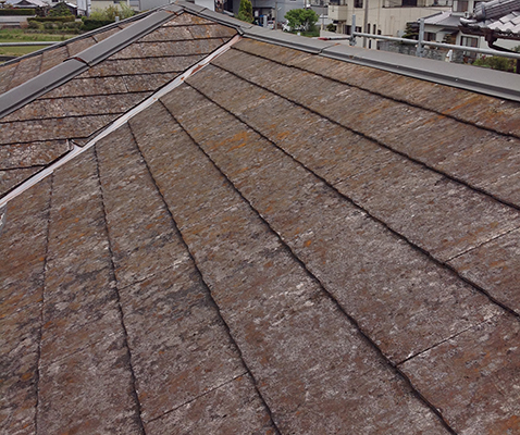 紫外線をよく浴びる屋根であるカラ-ベストは経年で徐々に色あせし、防水機能を無くしていきます。 やがて、スレート材の反りや剥がれに繋がり、雨漏りの原因となります。